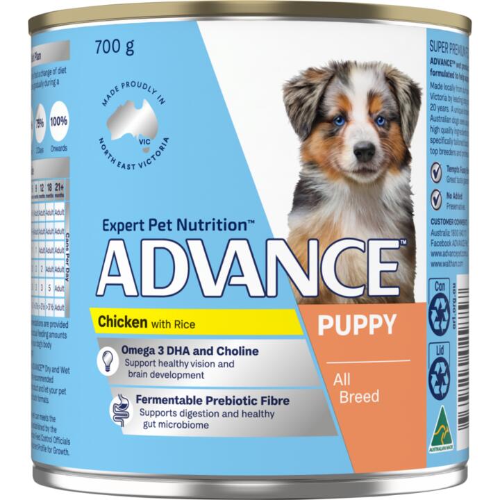 ADVANCE Puppy Wet Dog Food Chicken with Rice is a super premium, highly nutritious food designed to support the growth and development of your puppy. Made in Australia, this rich formula combines chicken and rice to provide essential nutrients for your pups health, backed by over 45 years of pet nutrition expertise.